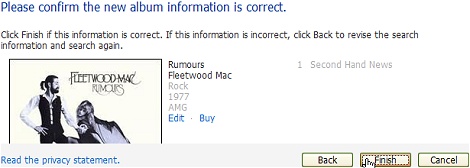 After you clicked Next, the album information is awaiting confirmation. If it is correct, simply click Finish to return to the main Media Payer screen. Your album art will now be displayed and all other album information will have been updated.